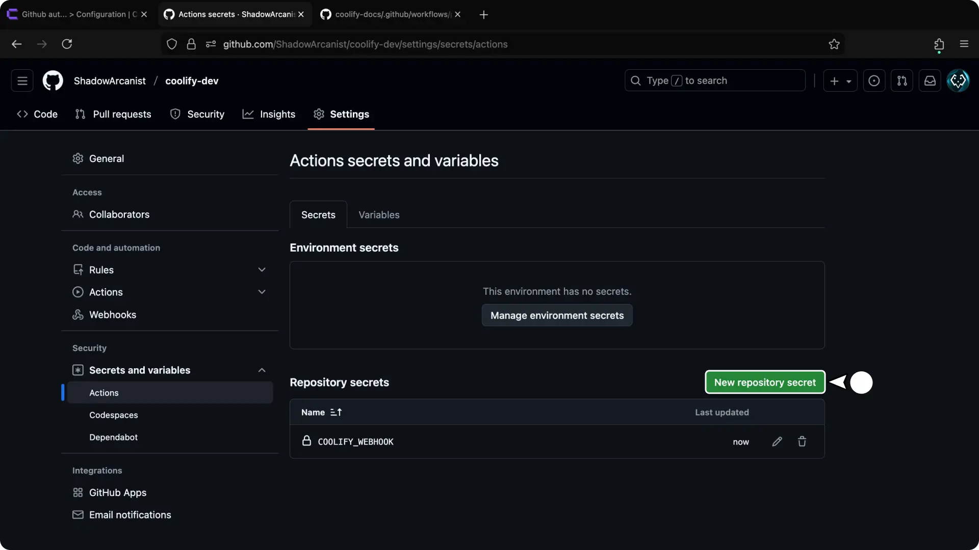 COOLIFY_WEBHOOKas the name. - Enter the Coolify deploy webhook URL as the secret (from step 4).