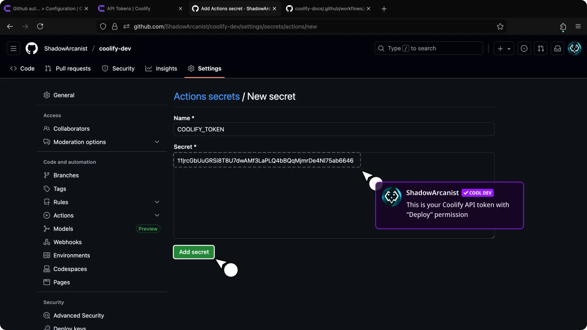 COOLIFY_TOKENas the name. - Enter the Coolify API token as the secret (from step 3).
