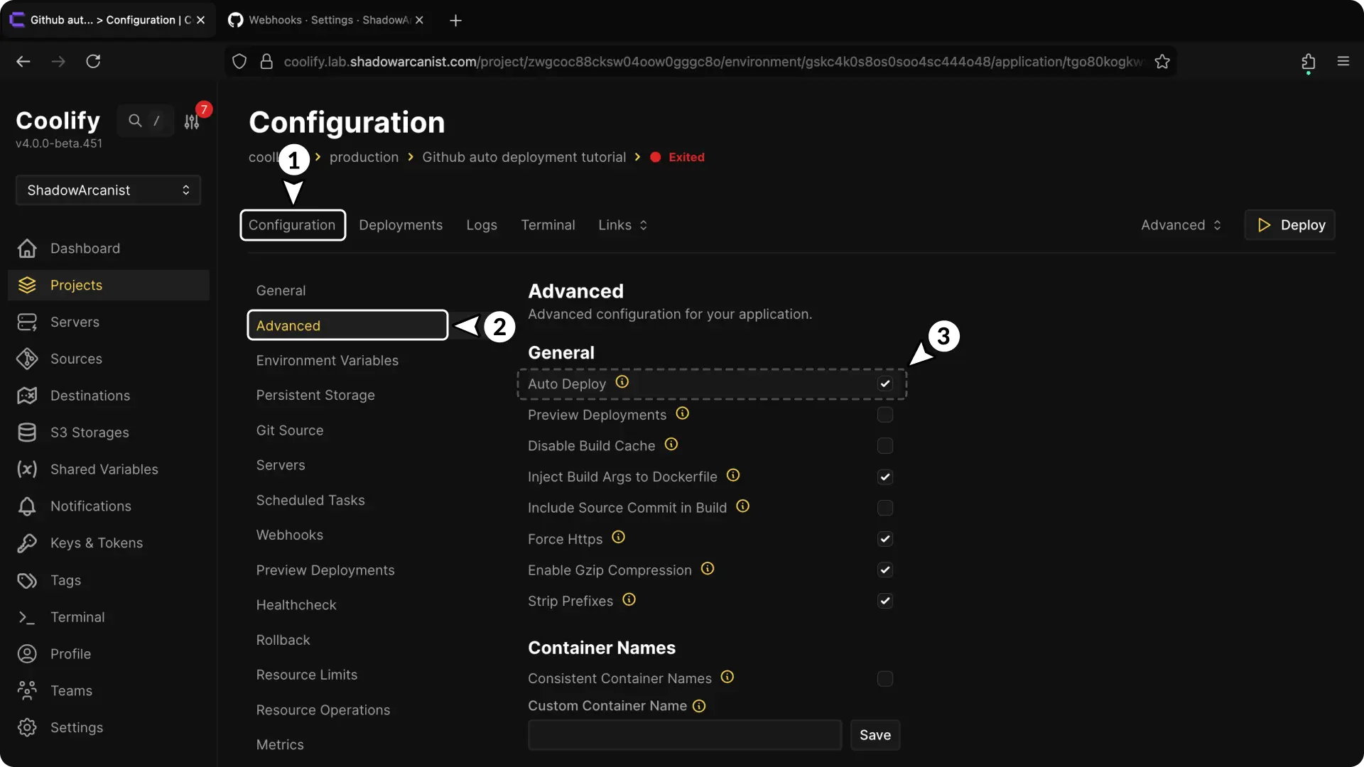 Coolify automatically enables "Auto Deploy" after you set up your GitHub App. If it doesn't, enable it on your application by following these steps: