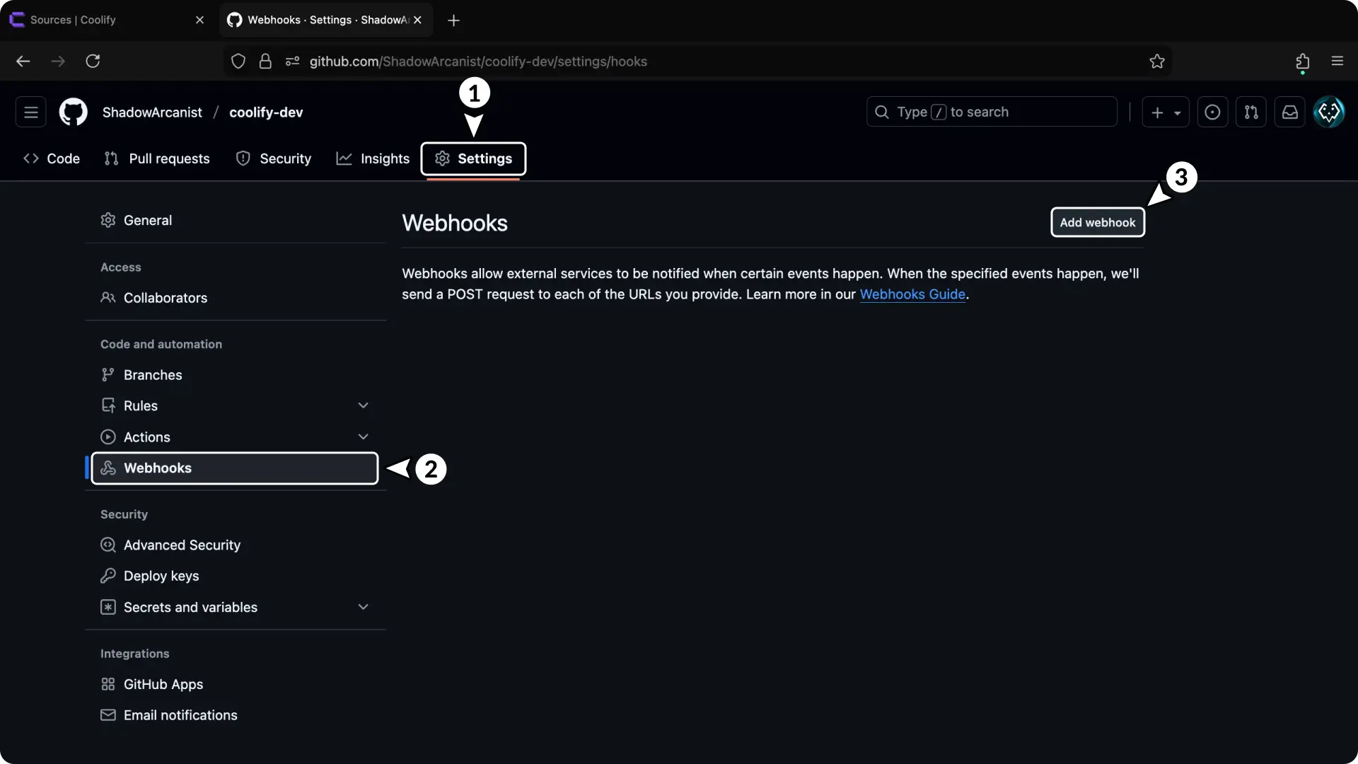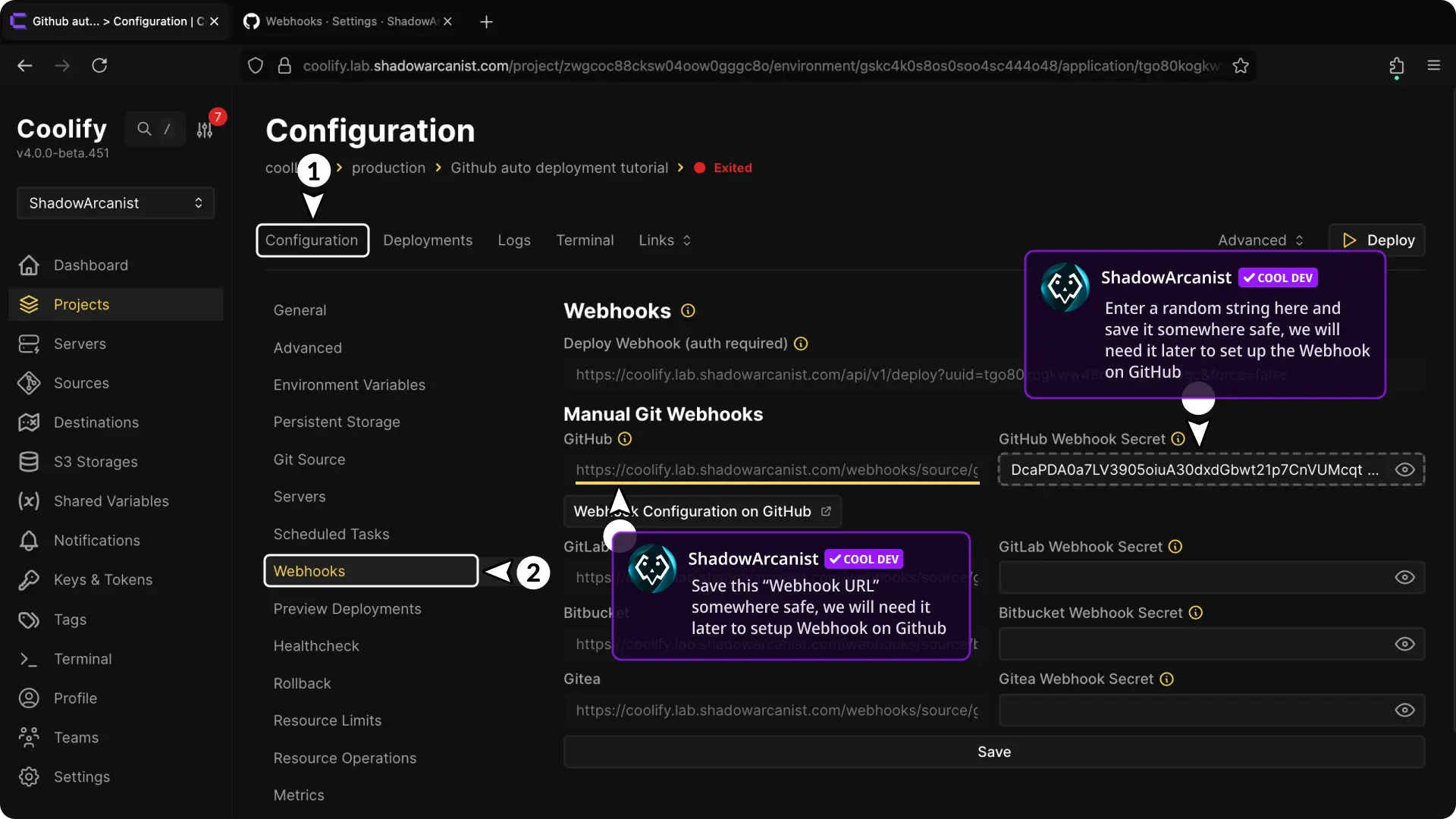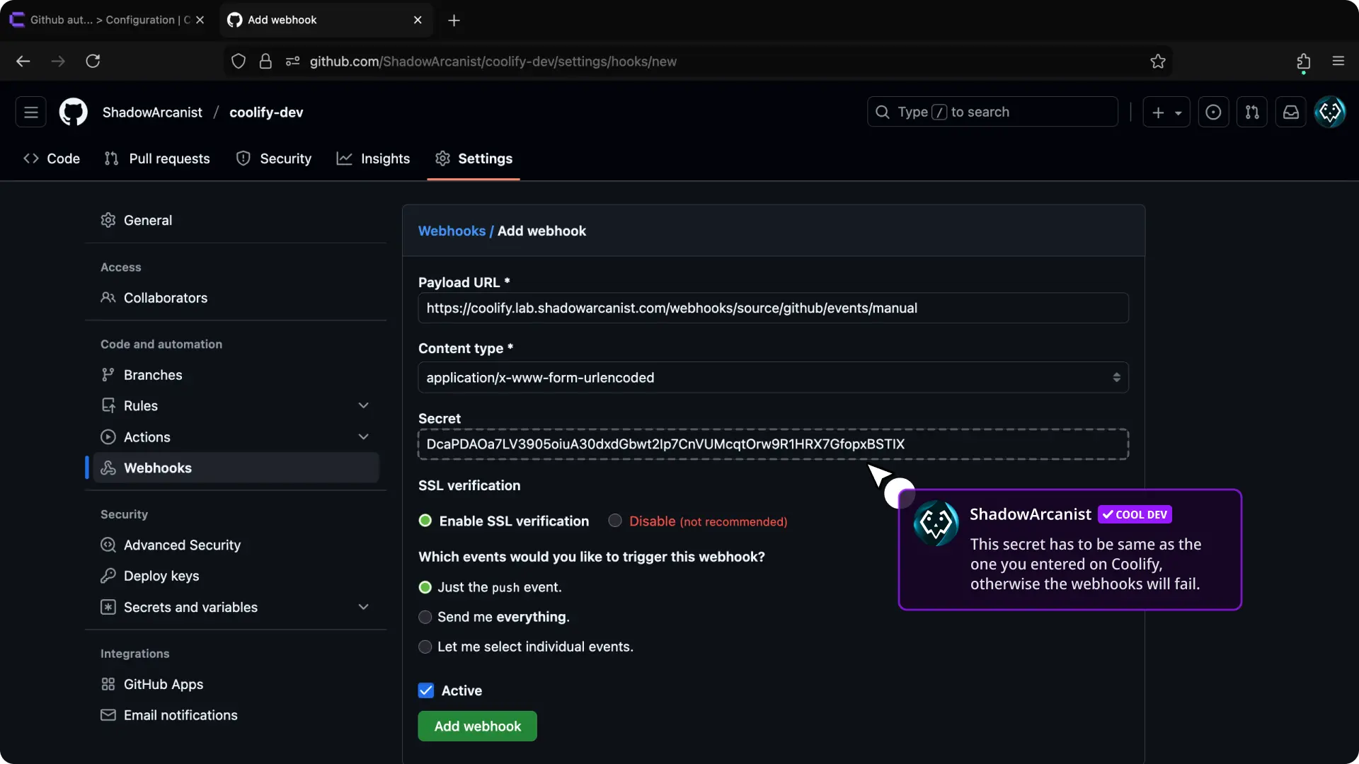 - Enter the webhook secret from Coolify in the "Secret" field.