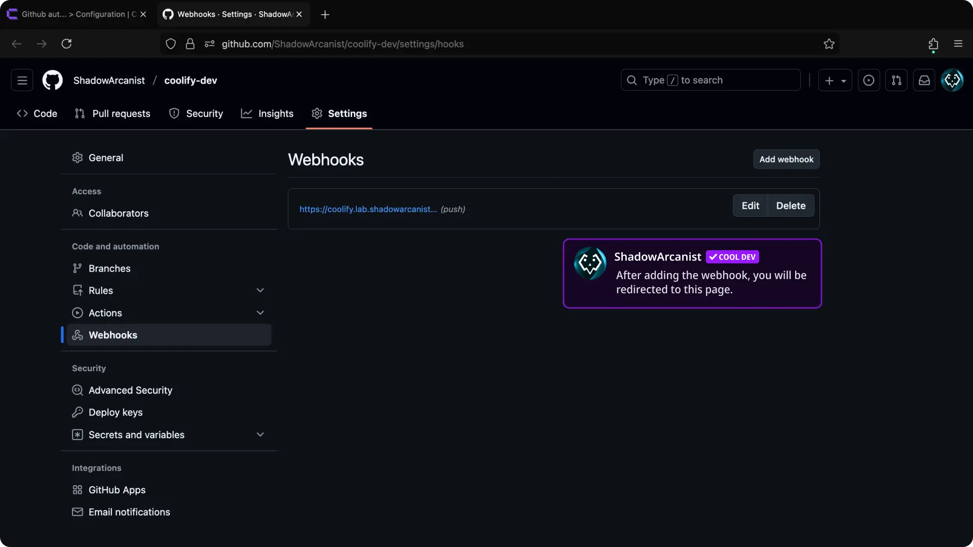 After clicking "Add webhook", you'll see a page like the one shown below:
