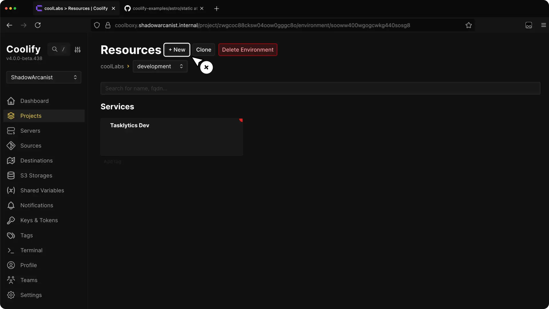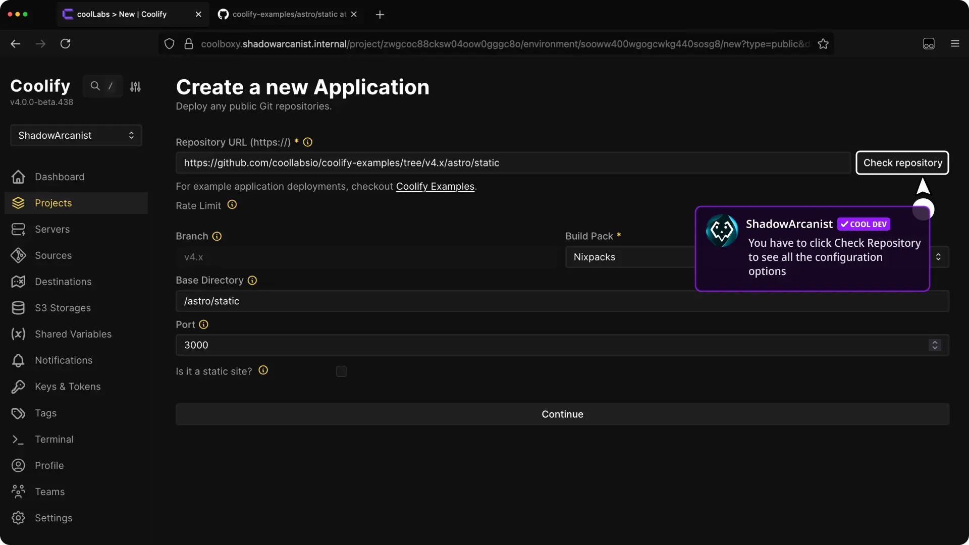 - https://github.com/coollabsio/coolify-examples/tree/nodejs-fastify → nodejs-fastify branch will be selected