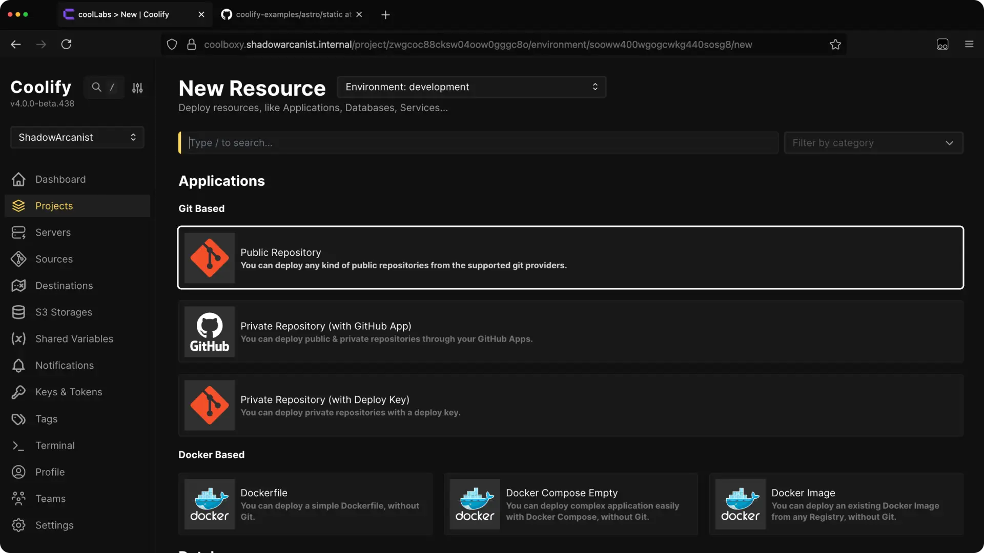 - https://github.com/coollabsio/coolify-examples → main branch will be selected.