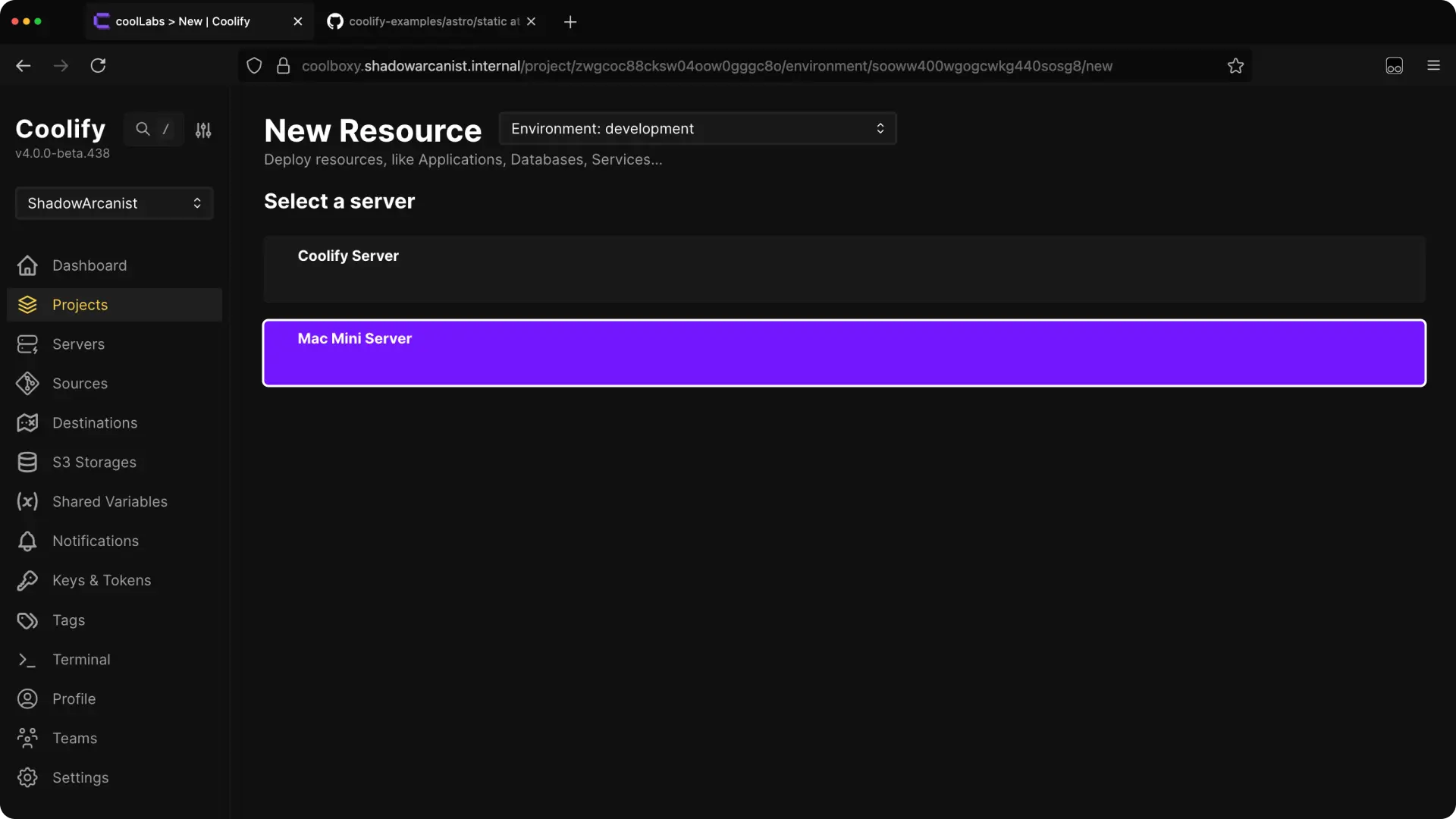 Coolify automatically selects the localhost server if you don't have any remote servers connected. In such cases, skip to the next step.