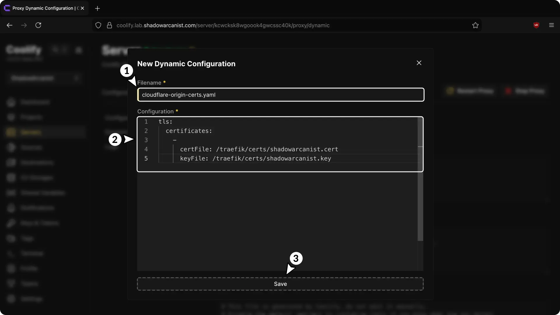 keyFile: /traefik/certs/shadowarcanist.key- Save the configuration