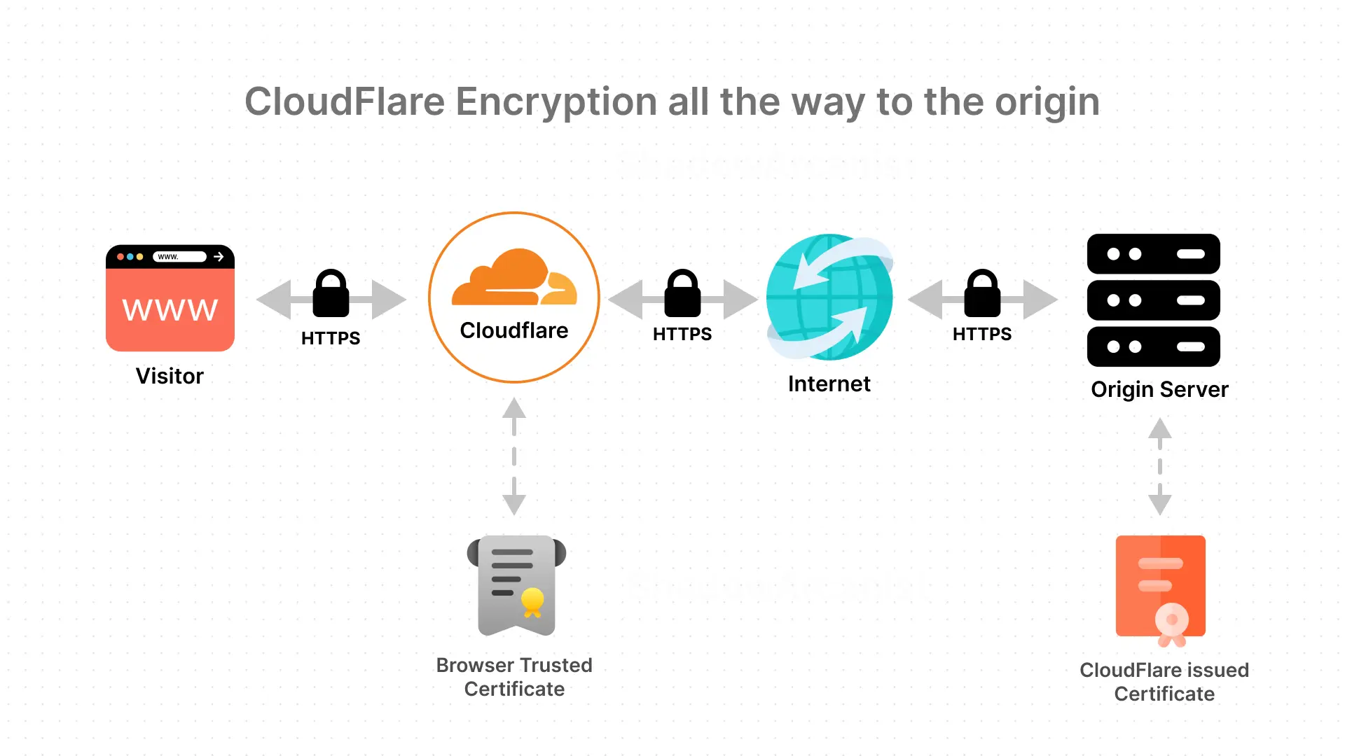 Communication between your server and Cloudflare is encrypted using a custom Cloudflare Origin Certificate (required when using Cloudflare’s proxy).