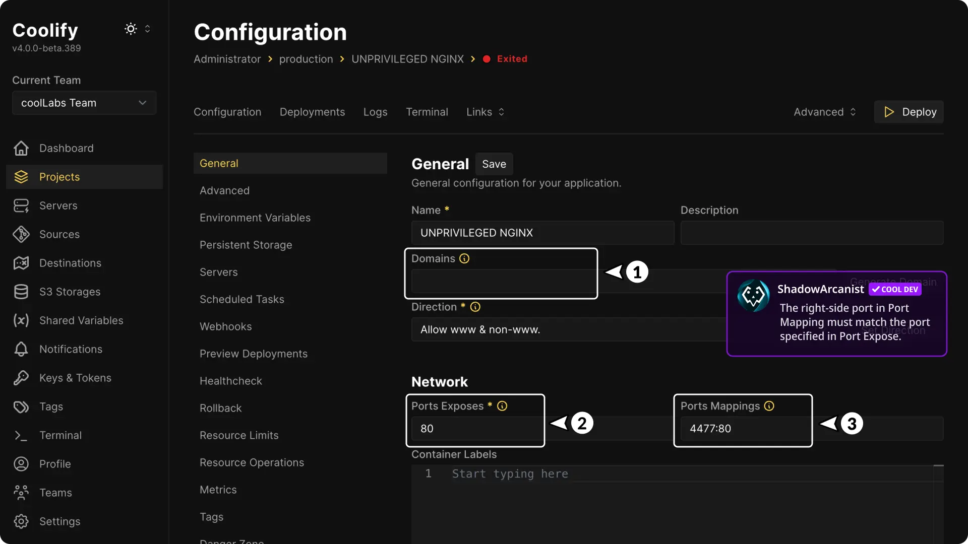- Set the correct port in Ports Exposed (the port your app uses).
