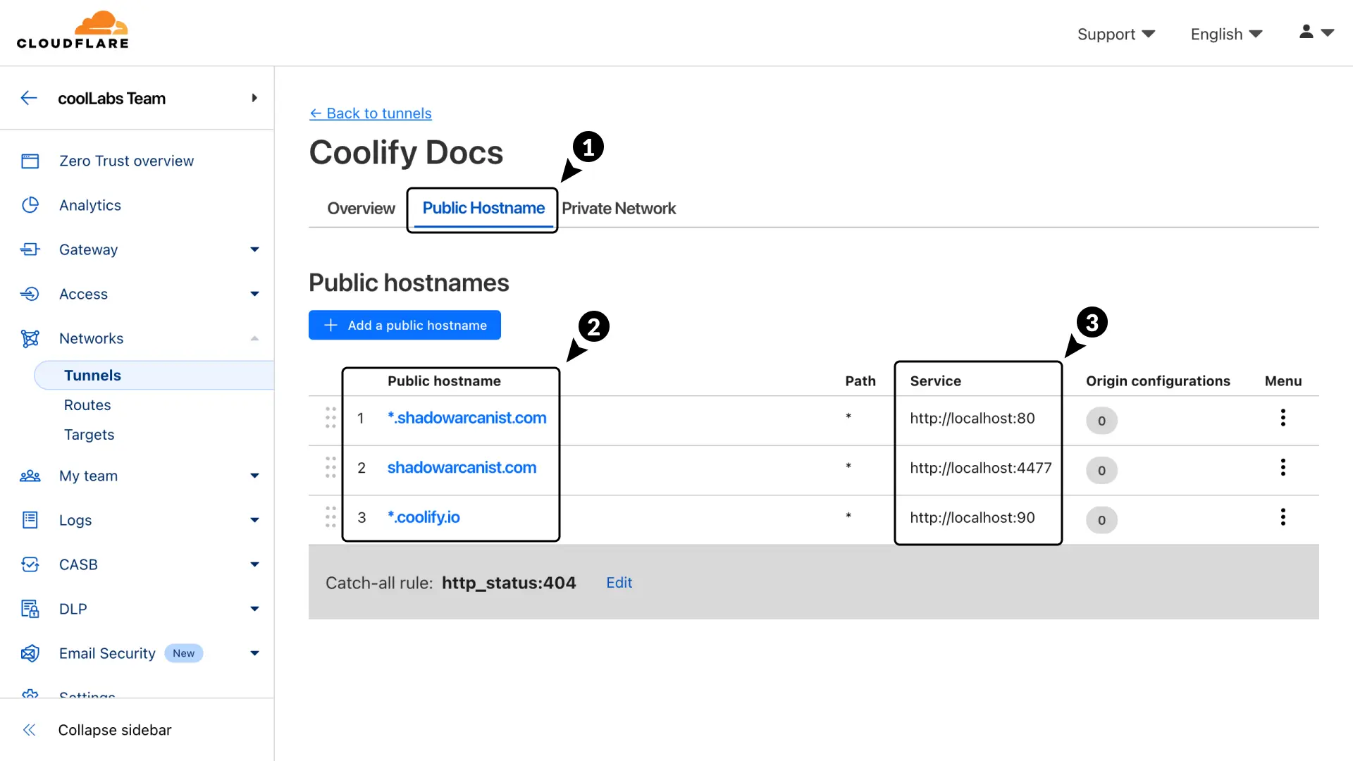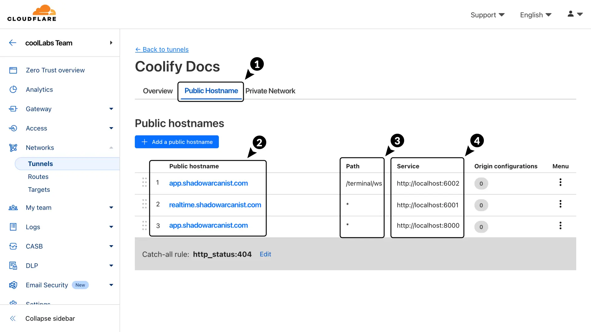 1. Create Public Hostnames in Cloudflare Tunnel ​