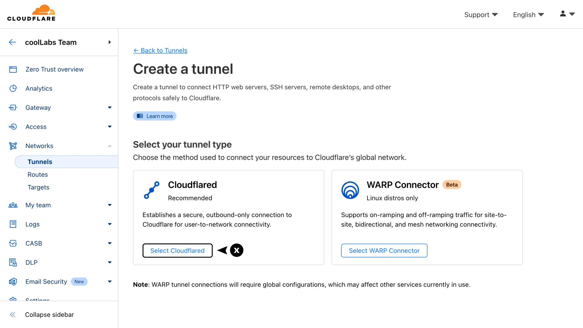 You will be prompted to choose a tunnel type. Click the Select Cloudflared button.