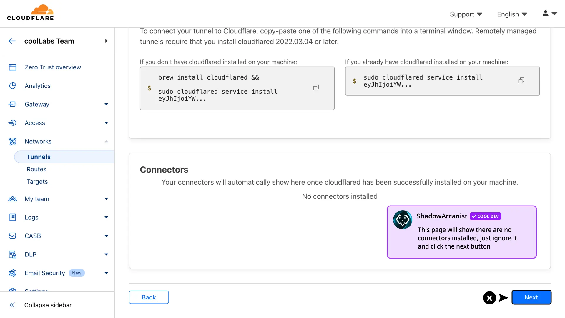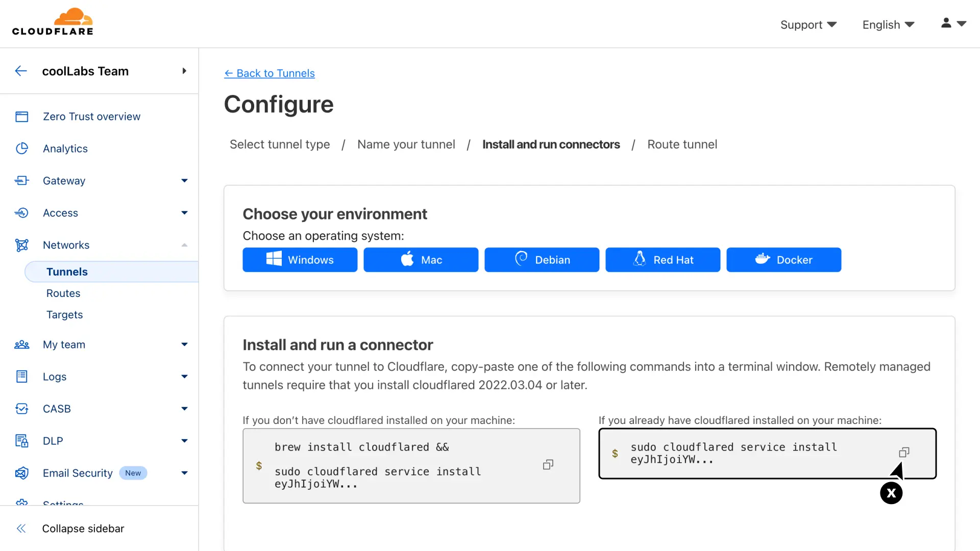 Next you will see the configuration page with multiple options to install cloudflared.