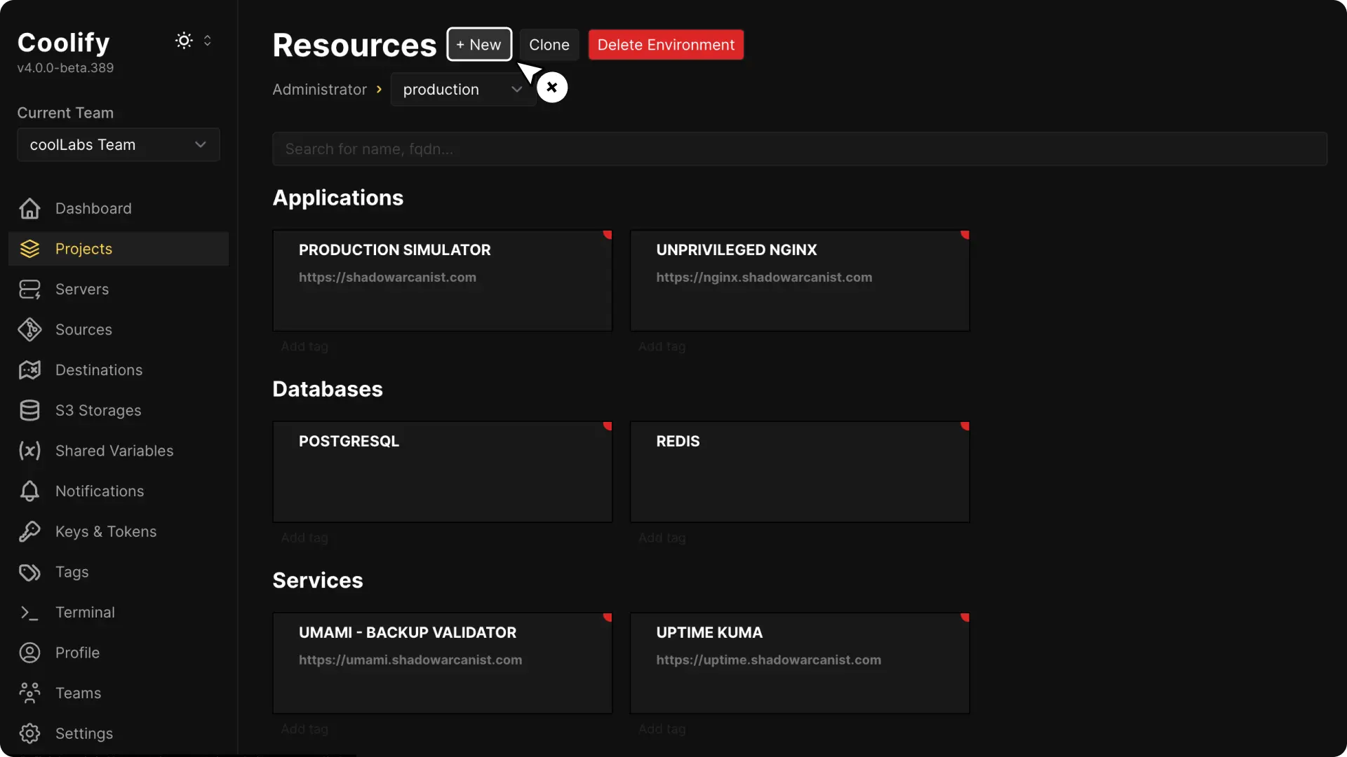 Go to your project on Coolify dashboard and click the + New button to create a new resource.