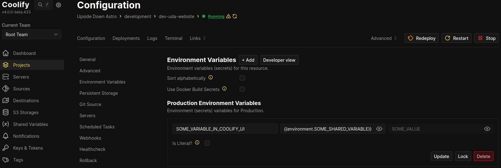 SOME_VARIABLE_IN_COOLIFY_UI={{environment.SOME_SHARED_VARIABLE}}Or in the normal view, the Name is what's referenced in the Docker Compose file SOME_VARIABLE_IN_COOLIFY_UI with the Value being the referenced environment variable {{environment.SOME_SHARED_VARIABLE}} as seen below. Once saved if correct, you'll see there's a third text box, if you reveal this, you should be able to see the true value, in this case SOME_VALUE.