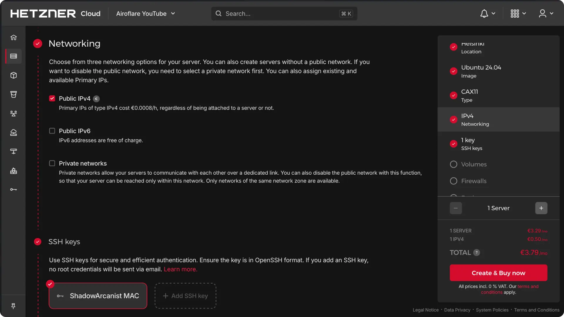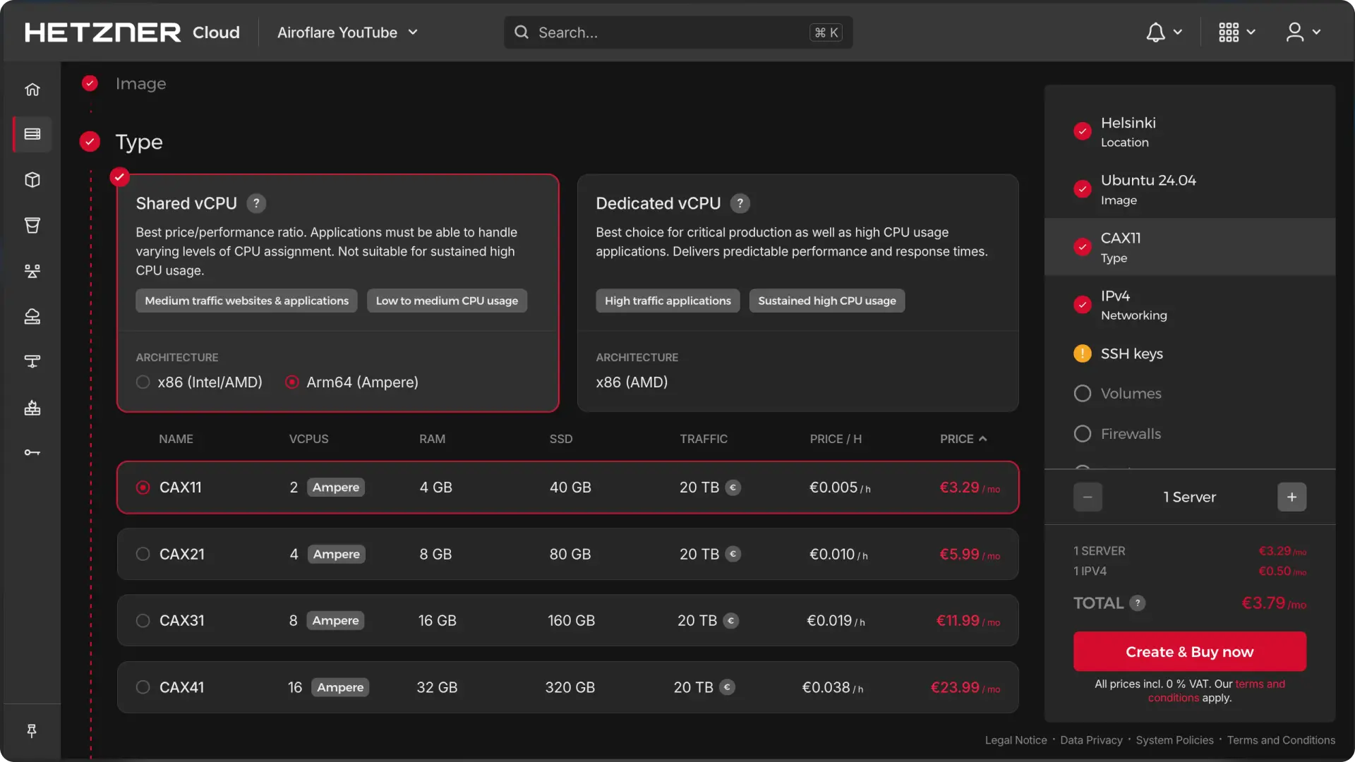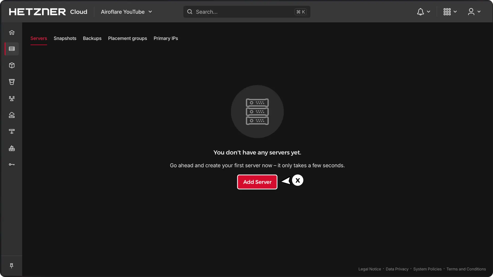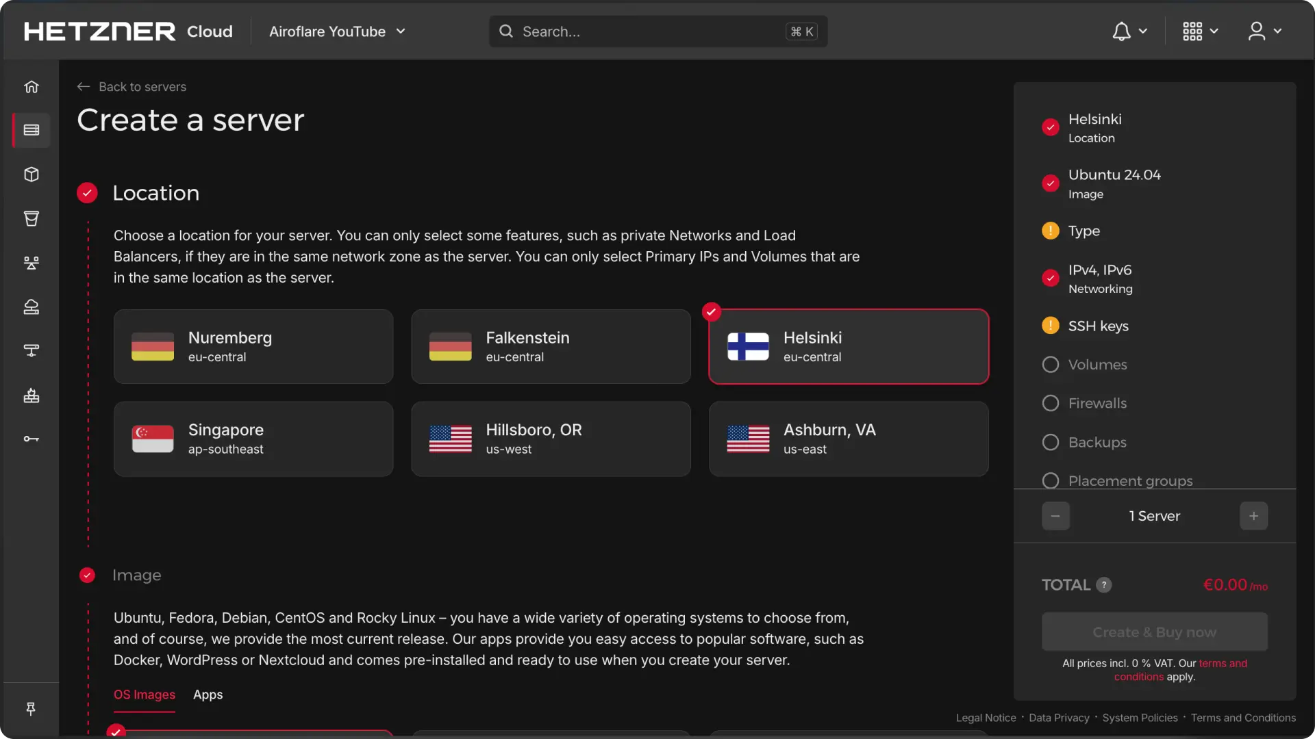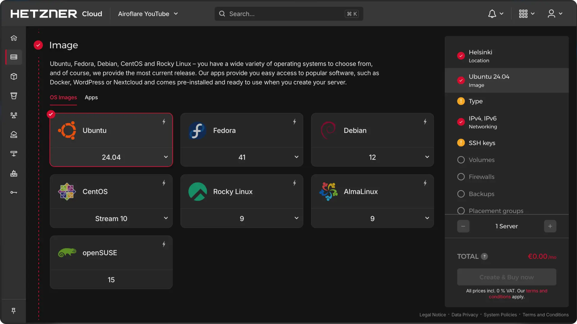 - Create a New Server: Log into Hetzner Cloud Dashboard ↗ and create a new server.