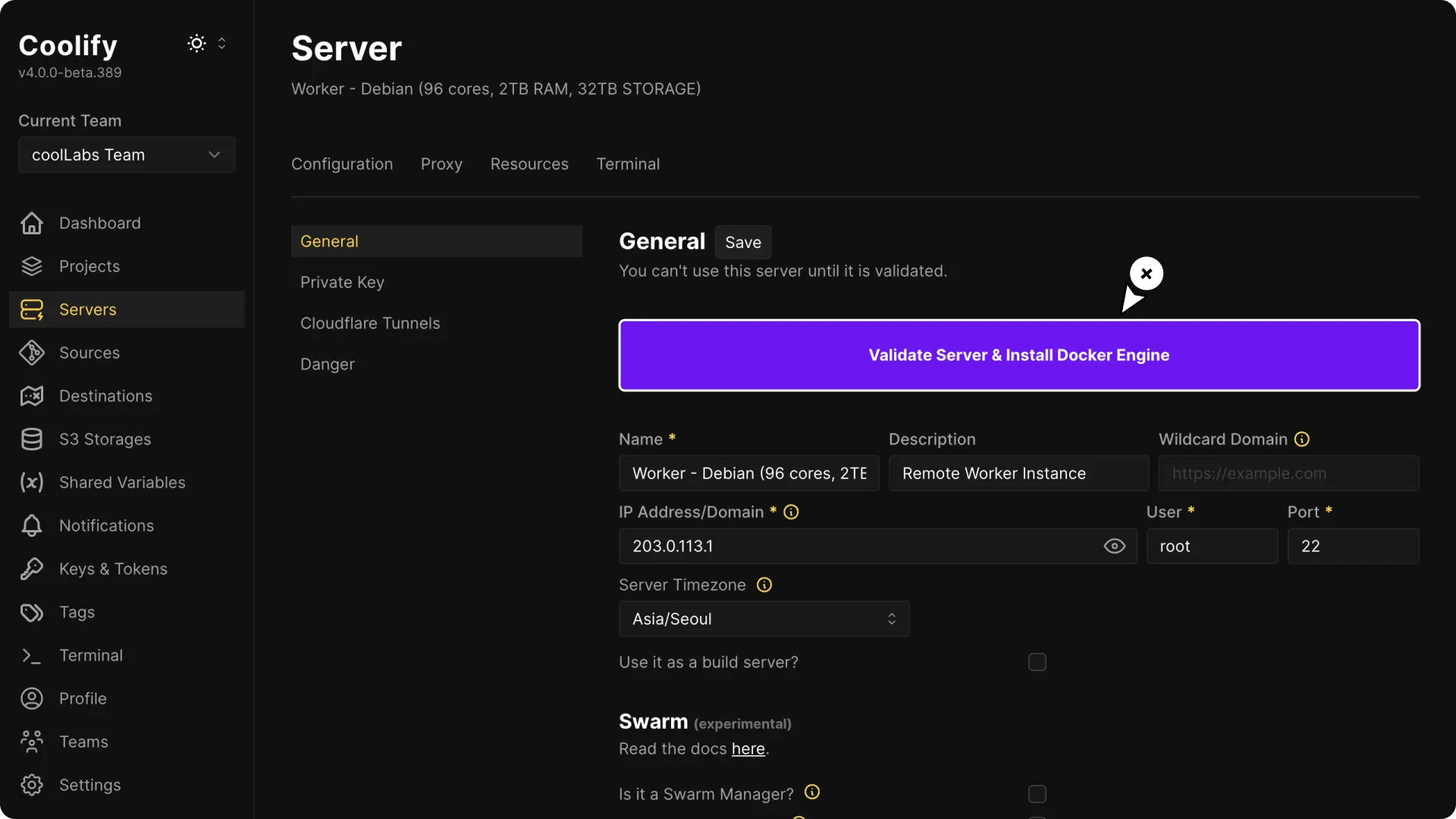 - Validate Server: Click Validate Server & Install Docker Engine. Coolify will automatically install all necessary components on your server.
