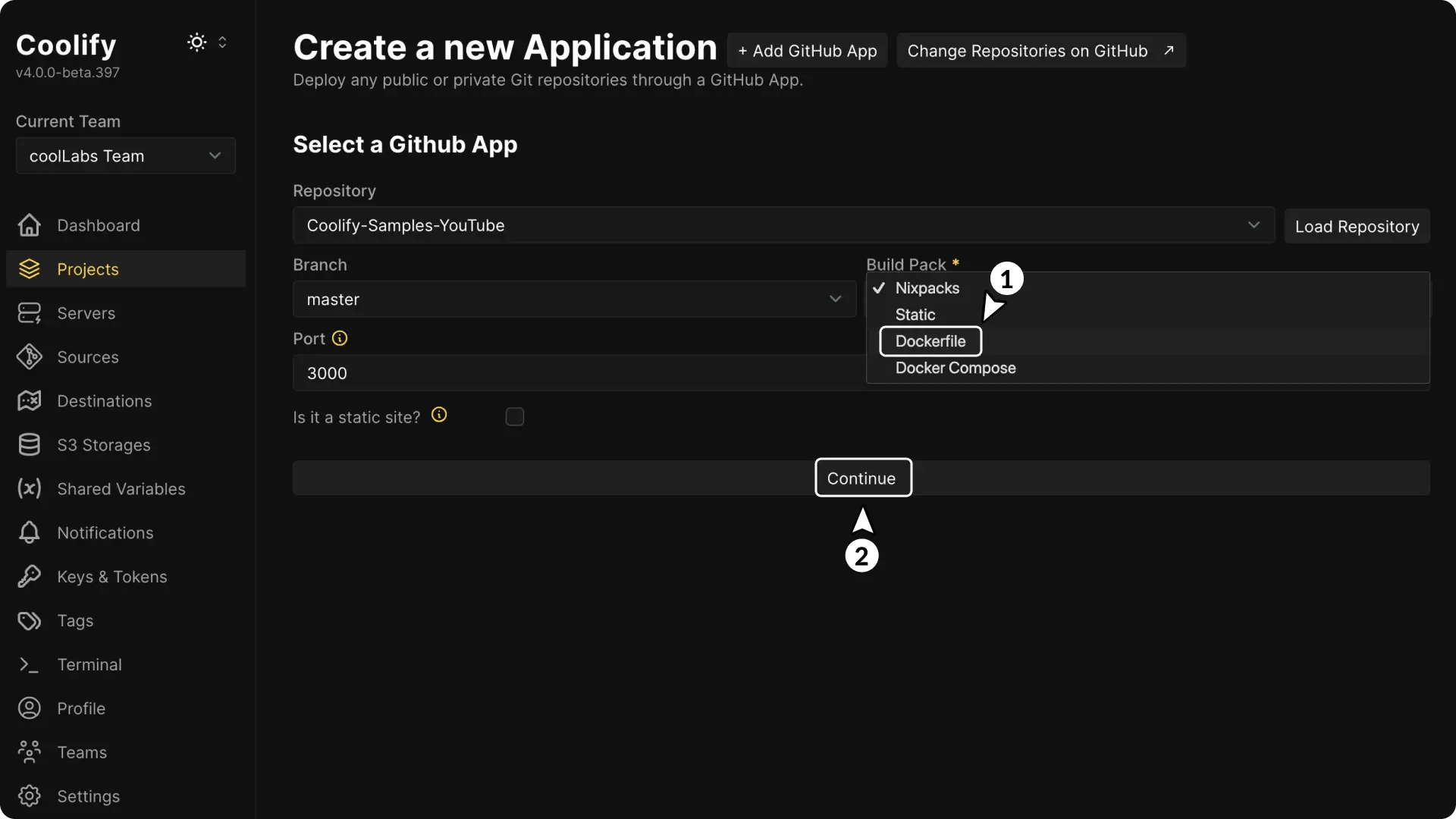 - Select Build Pack: Change the Build Pack to Dockerfile and click on continue button.
