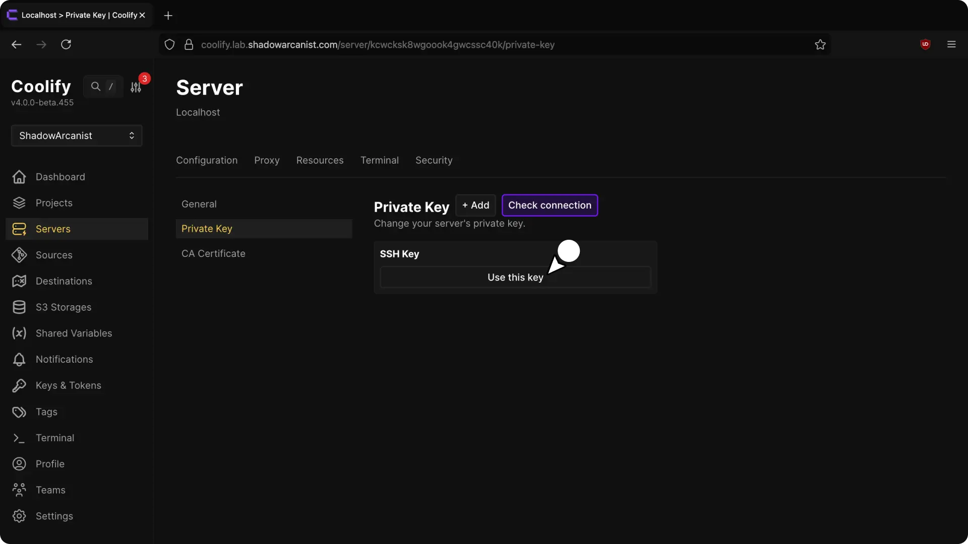 cat /data/coolify/ssh/keys/[email protected]- Login to your Coolify dashboard and Add a new private key